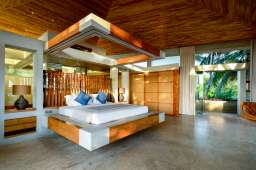 Every element of the villa, from the feature walls, built in furniture, the sculptural floating brass and teak staircase, to the chandeliers and wood and stone carvings has been meticulously custom designed.